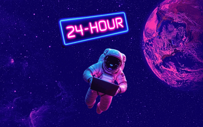 24-Hour Presentation Revamp Process: Astronaut-themed visual highlighting three key stages—Strategic Audit, Visual Overhaul, and Quality Control & Delivery—for fast, professional slide transformation tailored to healthcare marketing.